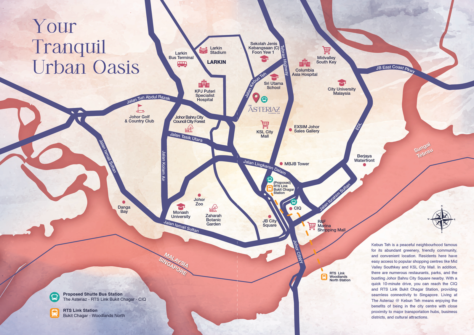 The Asteriaz @ Kebun Teh is strategically located in the vibrant heart of Johor Bahru, offering unparalleled connectivity and convenience. Situated in Kebun Teh, this modern development provides easy access to key destinations, including JB CIQ, city amenities, and surrounding commercial hubs. With nearby infrastructure enhancements like the upcoming RTS Link and ART station, commuting to Singapore will become significantly faster and more efficient. Surrounded by local markets, schools, and lifestyle facilities, The Asteriaz combines urban living with a community-focused atmosphere, making it an ideal choice for residents seeking comfort, connectivity, and a thriving neighborhood to call home.